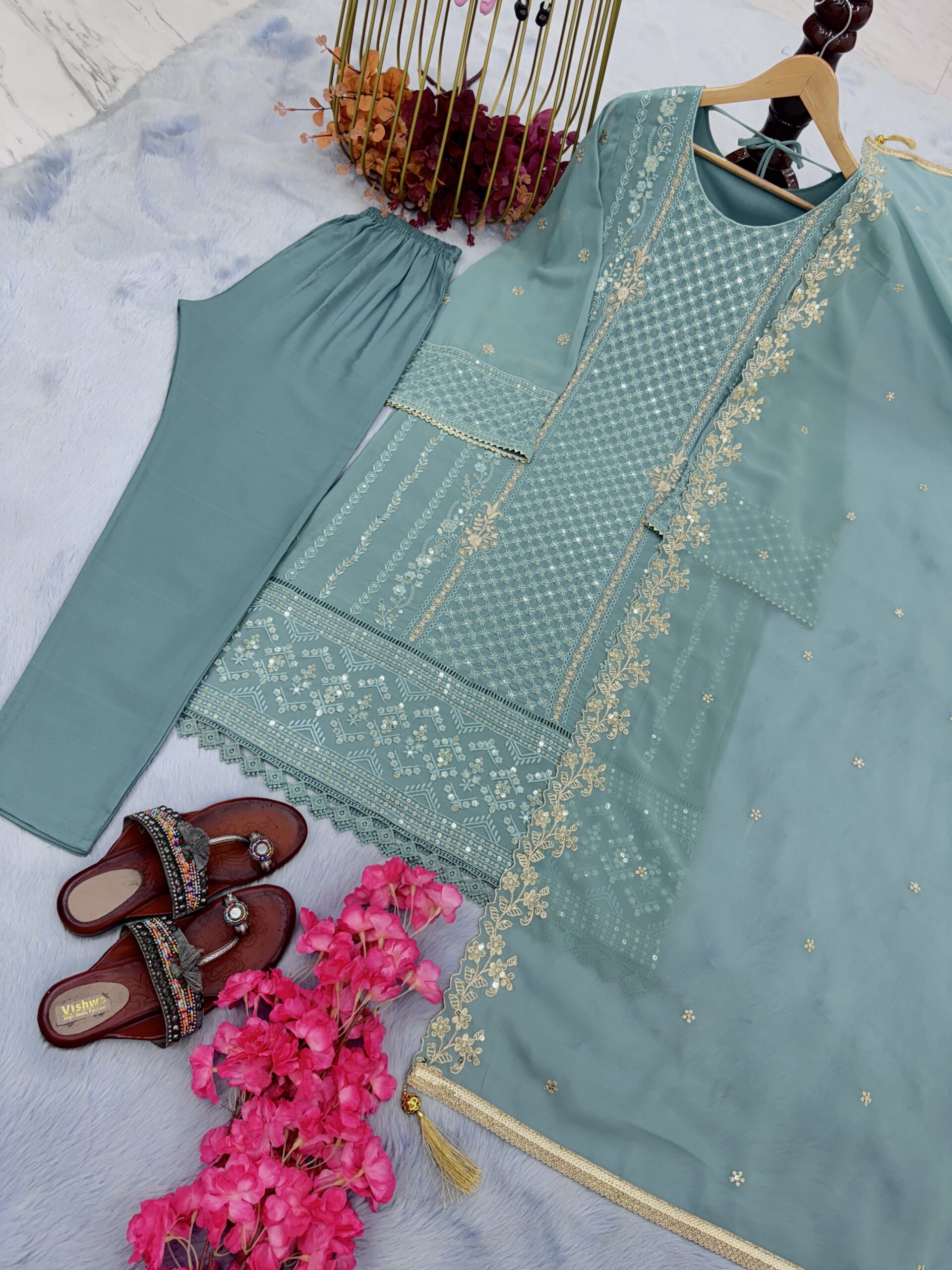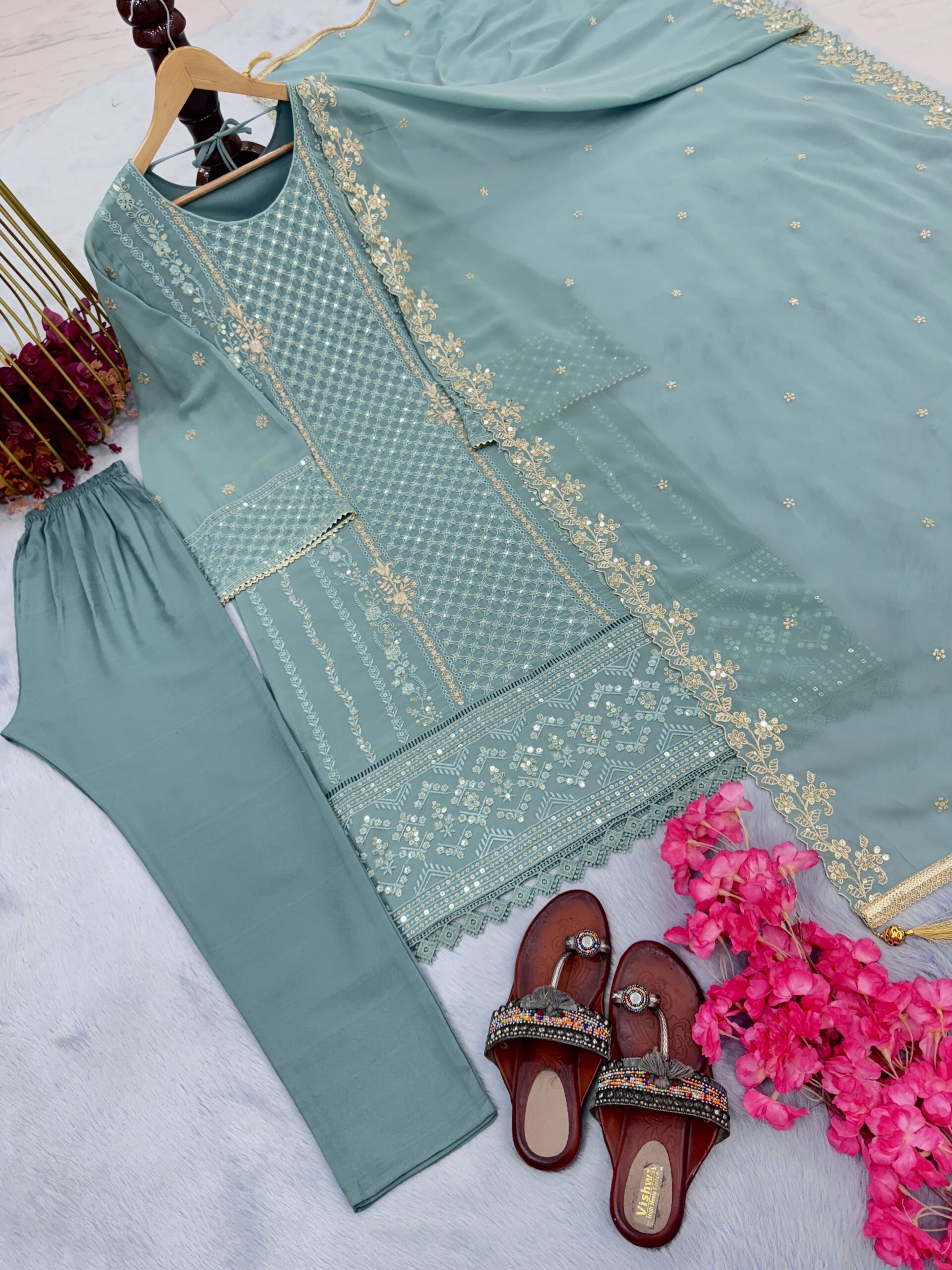 *Top Fabric* :Heavy Faux Georgette With Embroidery 5 mm Sequence Work With Gpu Leac Border With Fancy Bell Sleeve
