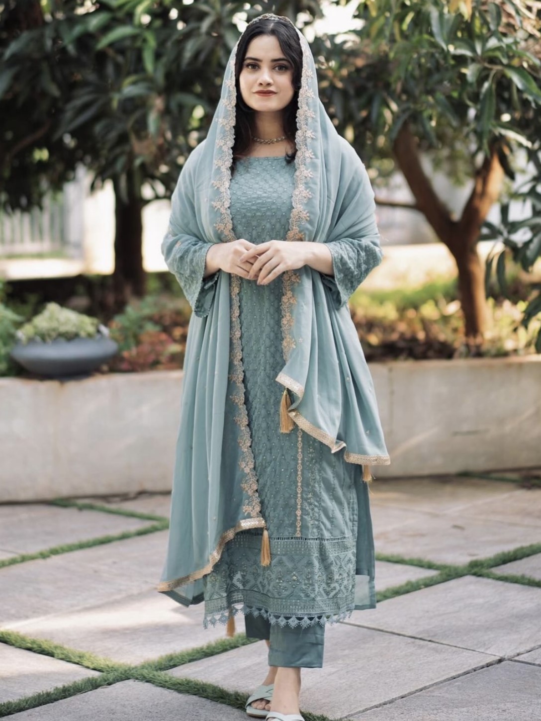 *Dupatta Fabric*:Heavy Faux Georgette With Embroidery 5 mm Sequence Work With Cutwork With Lace Border With Latkan